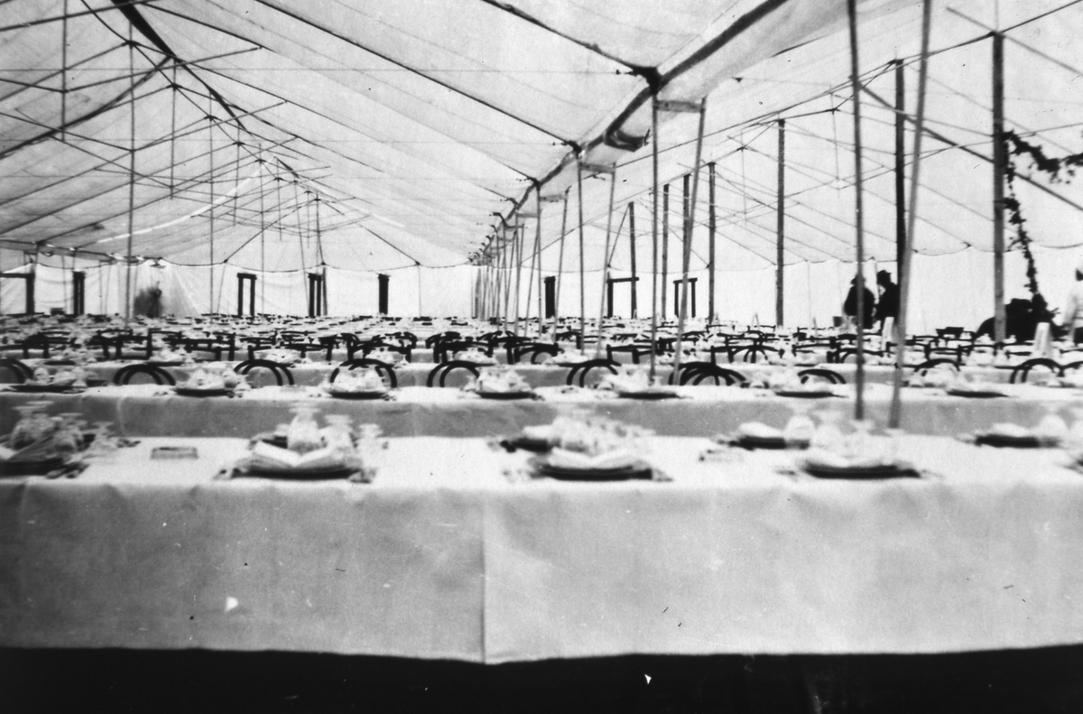 Festborden är dukade till kungalunchen på riksdagens 500-årsjubileum. Ett tält är uppsatt på Hamntorget.