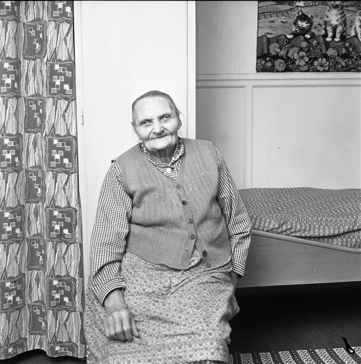 Kvinna, 90 år, iklädd väst och kjol. Hon sitter intill sin säng. På väggen, över sängen, hänger en bonad med katter. Till vänster, om kvinnan, hänger ett draperi.