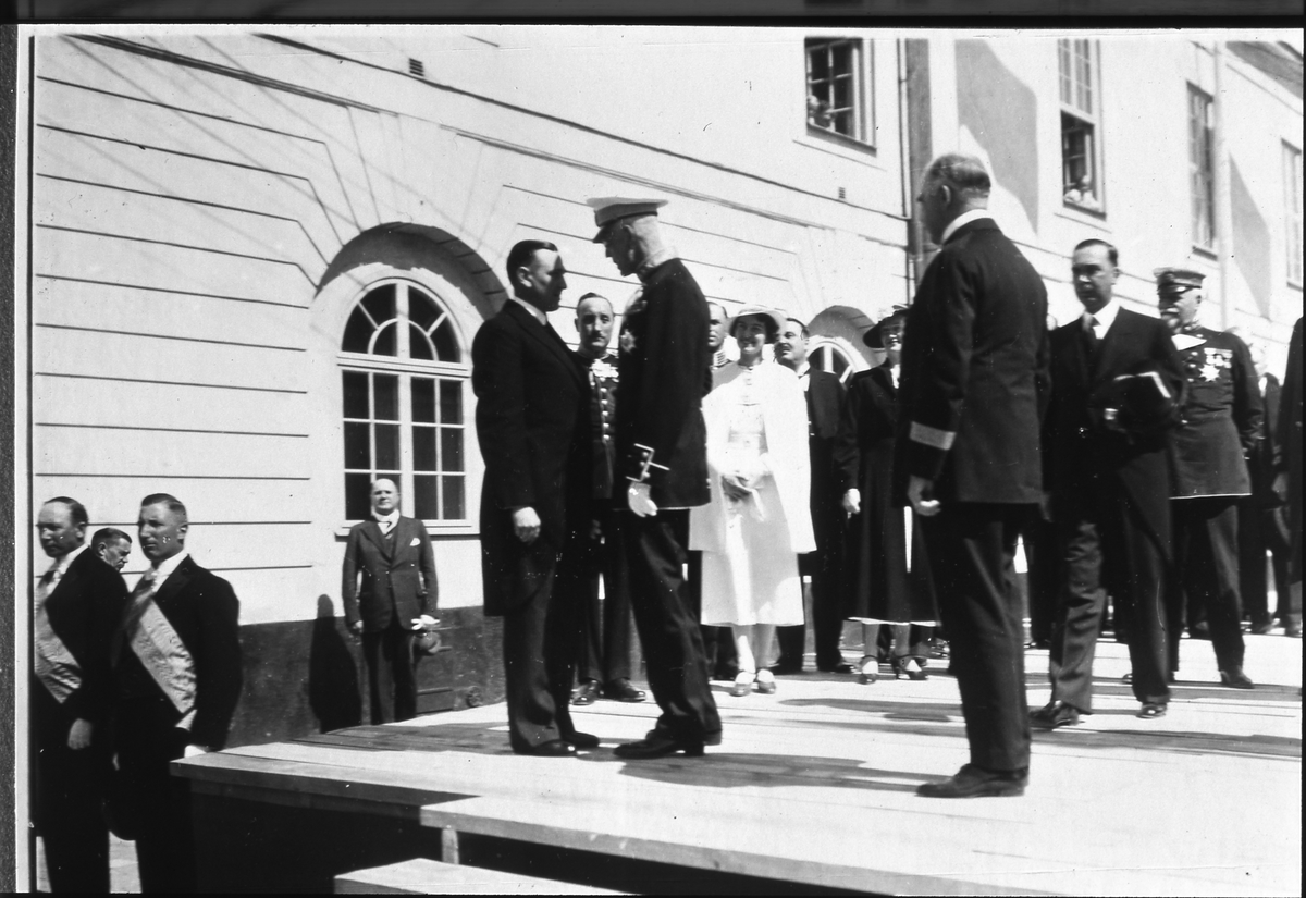 I Arboga firas Sveriges Riksdags 500-årsjubileum. Kung Gustaf V, och stora delar av den kungliga familjen, är på plats. En scen har byggt upp, för detta tillfälle, framför Rådhuset. Publik och blåsorkester står på Stora torget mitt emot (utanför bild). Här samtalar Konungen med borgmästaren Wilhelm Wester. Borgmästarinnan, i ljus klädsel, ser på. Bakom konungen står landshövding Valter Murray.