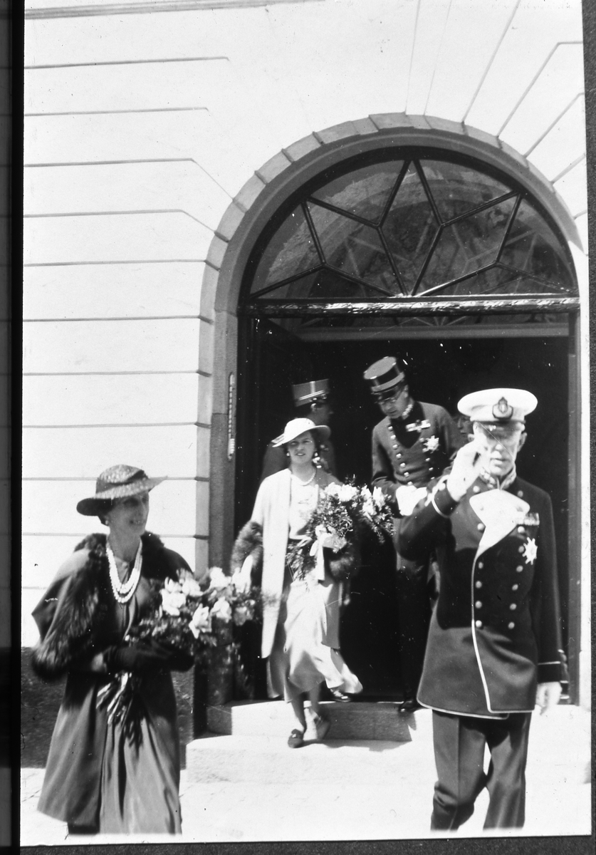 Från vänster; kronprinsessan Louise med svärfar kung Gustaf V. Bakom dem kommer prinsessan Sibylla med sin svärfar; kronprins Gustaf Adolf. Båda kvinnorna bär hatt och var sin stor blomsterbukett.