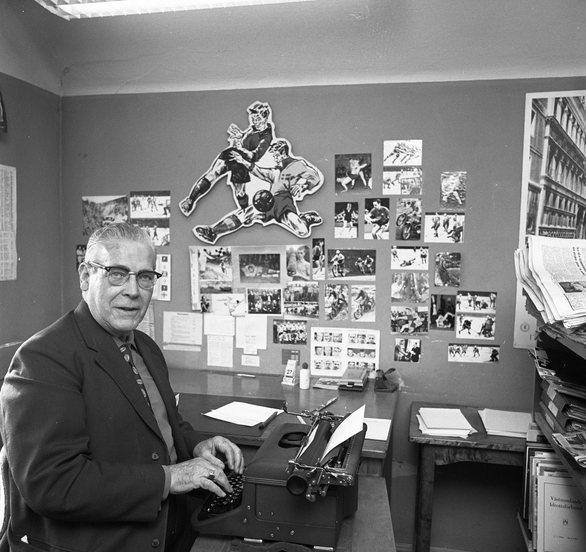 Arboga Tidning, personal och interiör. En man sitter vid skrivmaskinen. Han är förmodligen sportjournalist. På väggen sitter en stor samling idrottsfotografier. I bokhyllan, framför mannen, står en skrift med titeln "Västmanlands Idrottsförbund".
