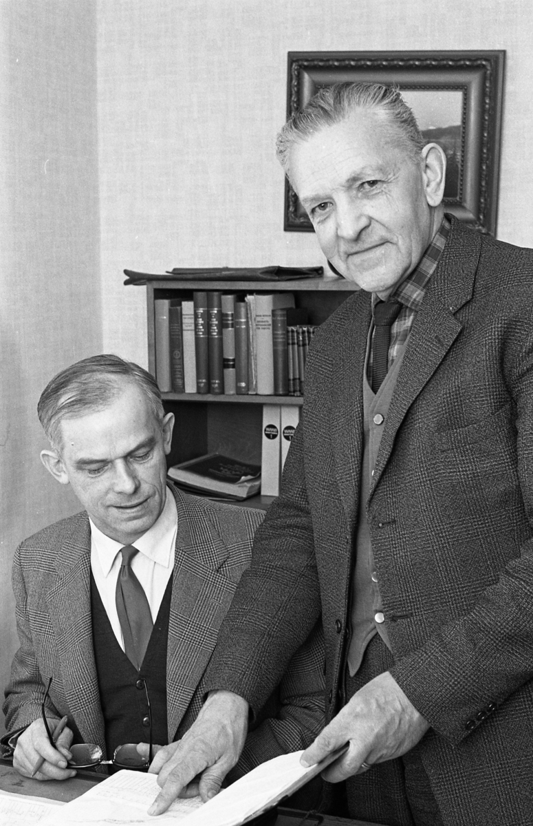 En man sitter vid ett bord, den andre står. Bakom dem finns en hylla med böcker och en tavla på väggen.