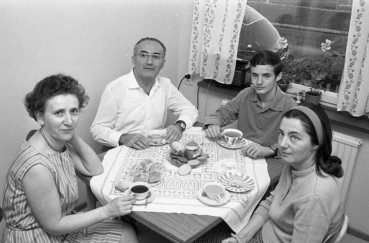 Bordet är dukat med kaffekoppar och det bjuds på kakor och bullar. En man, två kvinnor och en ung man sitter vid bordet. I fönstret står en radioapparat och två pelargoner.