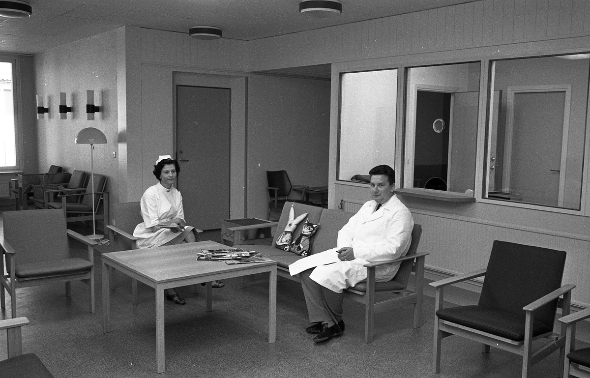 Kassa/reception/mottagningslucka bakom ryggen på doktorn. I väntrummet finns bord och karmstolar.