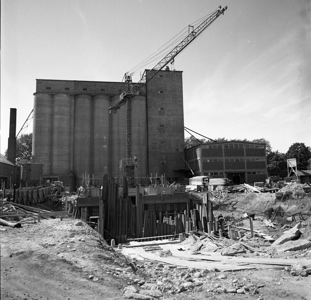 Centralföreningen bygger nytt. Lyftkran och bräder. Silon i bakgrunden.
