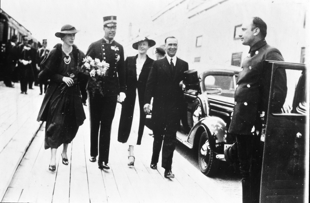 Riksdagsjubileet 1935 firas i Arboga. Kronprinsessan Louise och Kronprins Gustaf Adolf erbjuds biltransport till kyrkan.