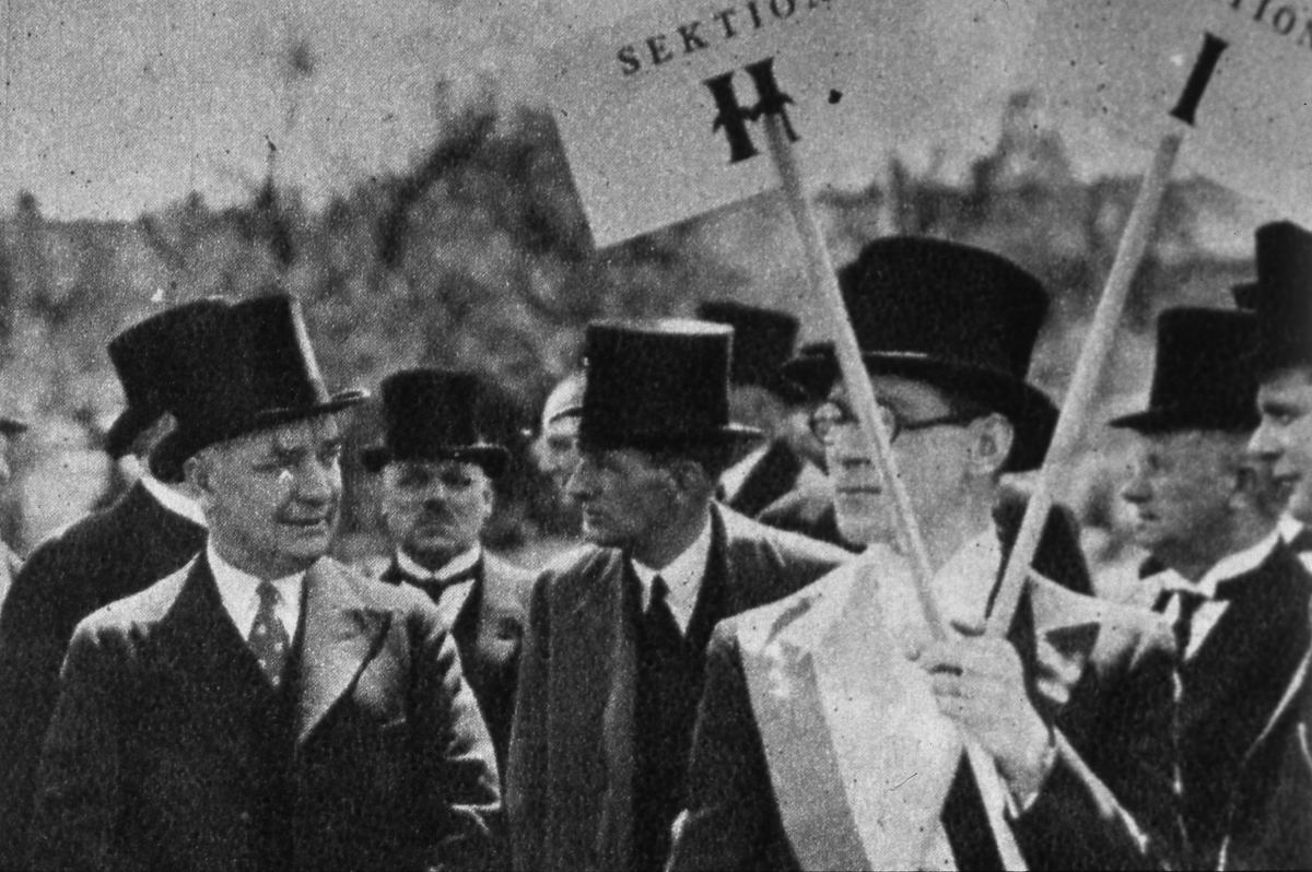 Riksdagens 500-årssjubileum firas i Arboga. Här ses delar av den svenska regeringen; statsminister Per-Albin Hansson, till vänster och finansminister Ernst Wigfors till höger. Alla män bär stormhatt.