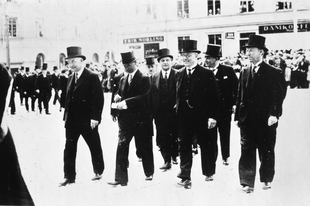 Regeringen är i Arboga och deltar i firandet av Sveriges riksdags 500-årsjubileum. Först sker en samling i Heliga Trefaldighets kyrka. Längst till vänster går statsminister Per-Albin Hansson.