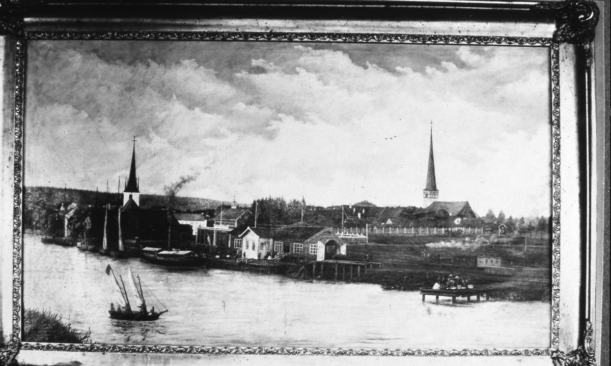 Arbogas båda kyrktorn; Heliga Trefaldighetskyrkan till vänster och Sankt Nikolai kyrka till höger. Det höga tornet, på Sankt Nikolai kyrka, blåste ner 25 januari 1889.