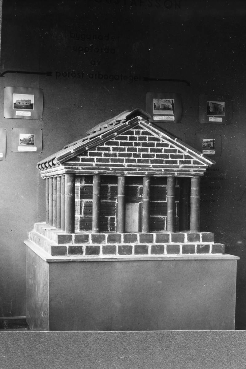 Arbogautställningen. En liten husmodell murad i tegel, med pelare i entrén och med takpannor på. Arboga Tegelbruks monter. De tillverkar både murtegel och taktegel.