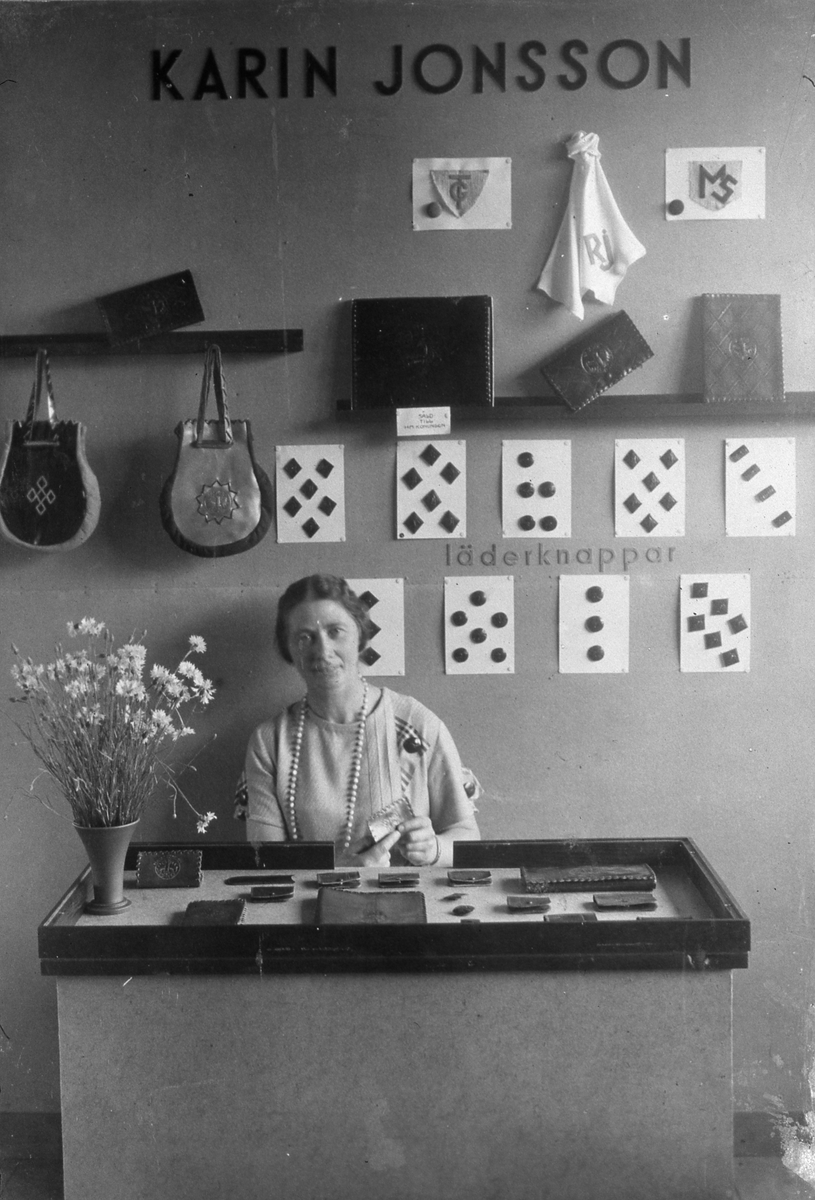 Karin Jonssons monter med läderarbeten. Här visas väskor, plånböcker och knappar av läder.