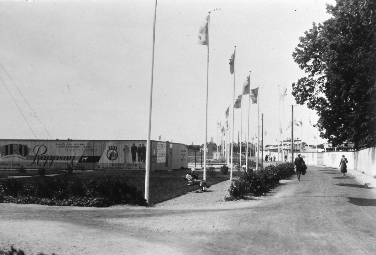 Dragmansgatan, fram till huvudentrén till Arbogautställningen. Flaggorna är hissade. Människor promenerar.