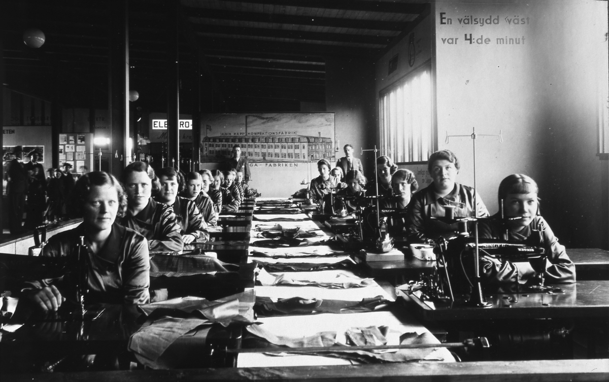 Här visas Albin Rapps Konfektionsfabrik upp sig, på Arbogautställningen. Sömmerskor arbetar vid sina symaskiner medan publiken ser på. En text på väggen lyder "En välsydd väst var 4:de minut". Längst bak i lokalen hänger en tavla föreställande fabriken.