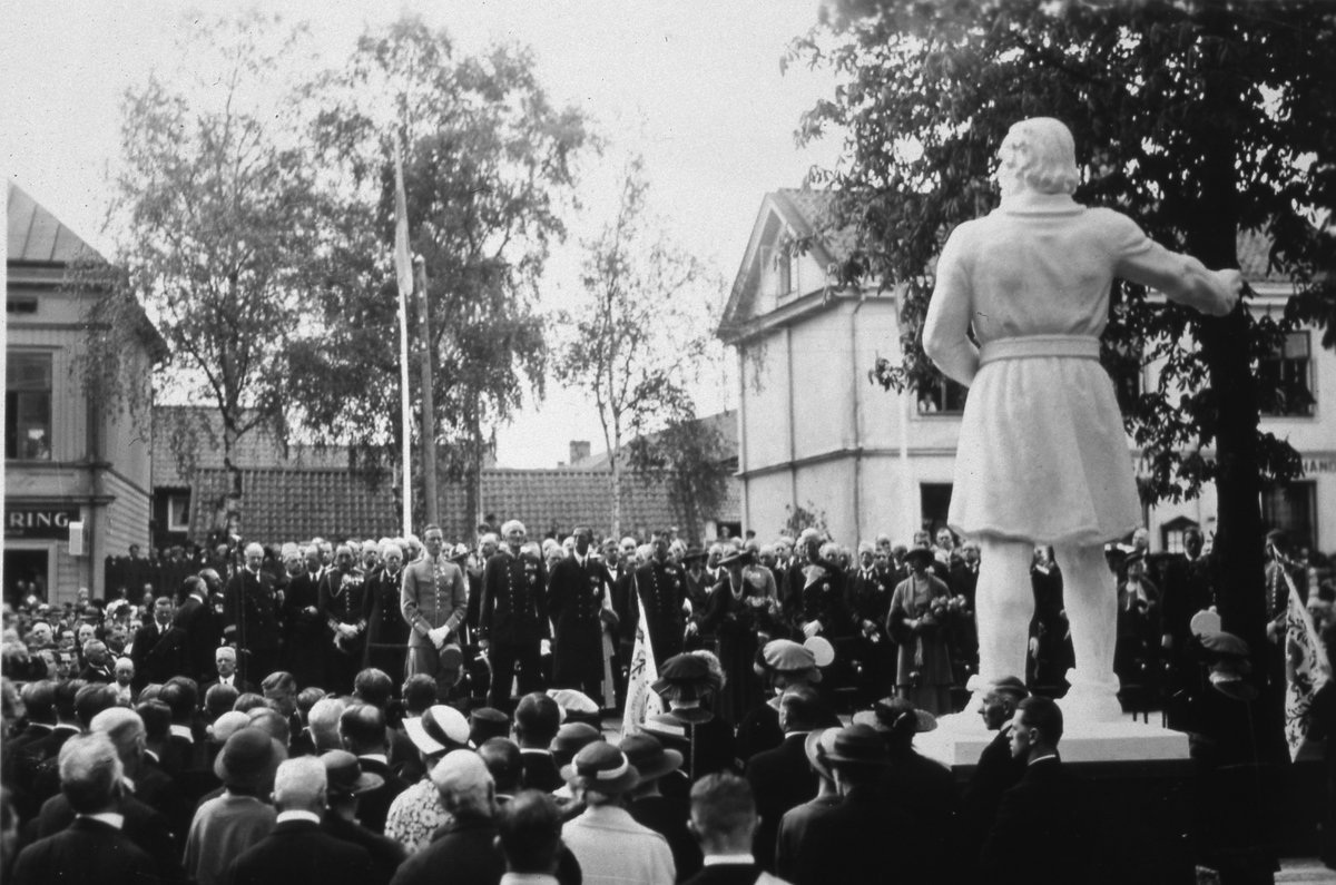 Det är mycket publik, på Järntorget, när Engelbrektstatyn avtäcks. Detta är ett led i firandet av Sveriges Riksdag. På podiet är den kungliga familjen samlad. Bland andra ses kronprins Gustav Adolf med hustru Louise.