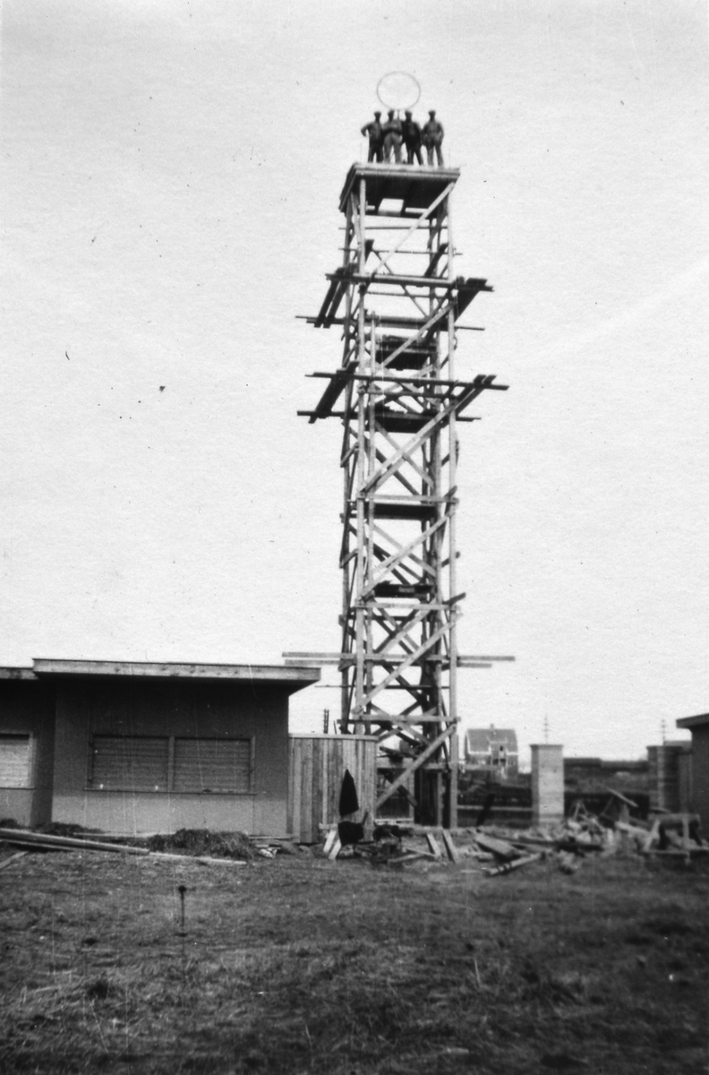 Arbogautställningen tar form. Obelisken är klar att beklädas med reklam. Fyra arbetare står på toppen och blickar ut över utställningsområdet.