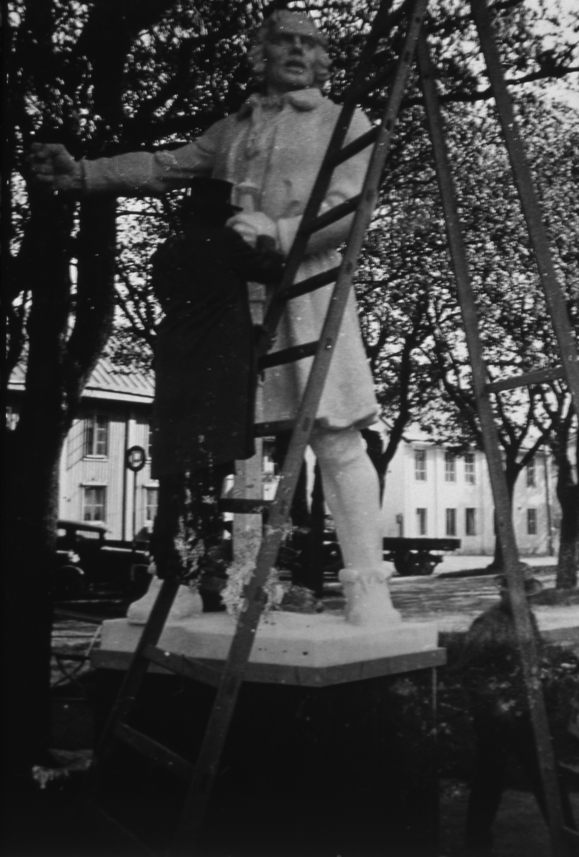 Konstnären Carl Eldh vann tävlingen om vem som skulle få göra en staty över Engelbrekt, till Riksdagens 500-årsjubileum. Här står han på en stege och gör några finjusteringar. Denna staty är nämligen i gips. Orginalstatyn transporteras till Arboga den 20 november.