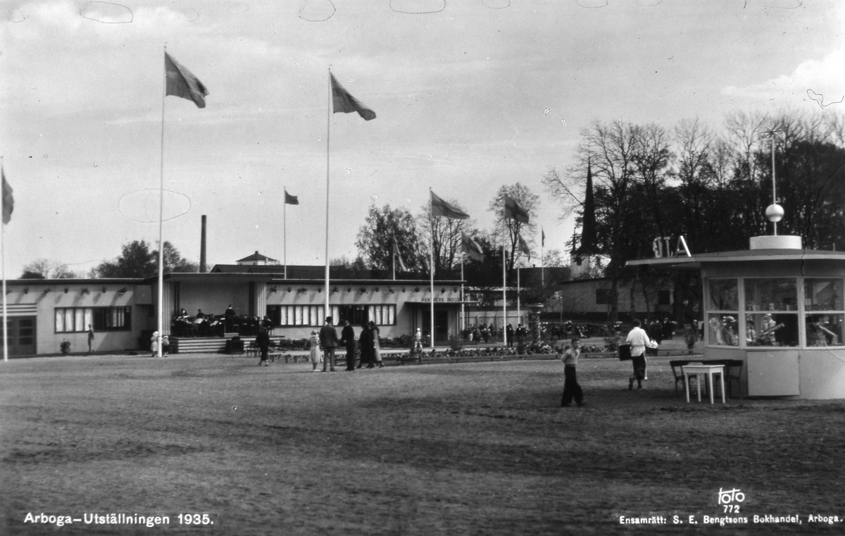Längst ner, till vänster, på vykortet står "Arboga-Utställningen 1935". Längst ner, till höger, står det "Foto 772, Ensamrätt: S.E. Bengtsons Bokhandel, Arboga.