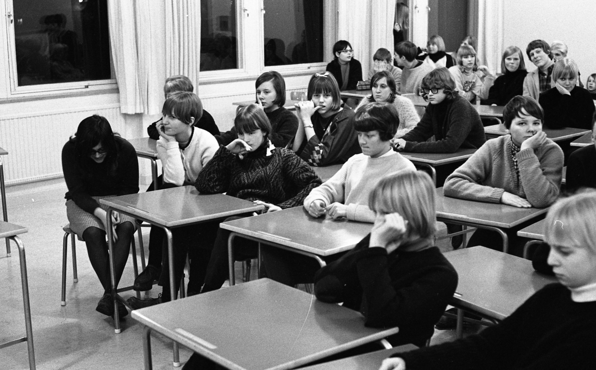 Flickan längst till vänster är Agneta Östman (gift Karlsson), bredvid henne, i ljus tröja, Christina Hagen. Bakom Christina sitter Anna-Greta Sjöberg. Bredvid henne, Käthe Tiborn. Ovanför Käthes huvud syns Agneta Darlsson. Bakom Käthe sitter Chatarina von Kartachew. Pojken som tittar på fotografen, och har hakan i handen, heter Ove Norman.
