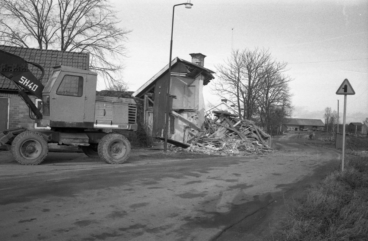 Huset i spillror. En grävskopa i förgrunden. En ladugård i bakgrunden.