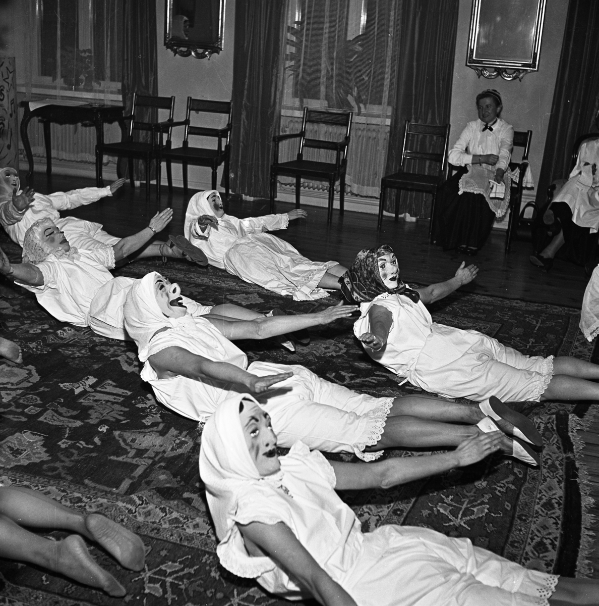 Spex på fest. Några utklädda gummor har gymnasikuppvisning på Stadskällaren. Serveringspersonal tittar på.