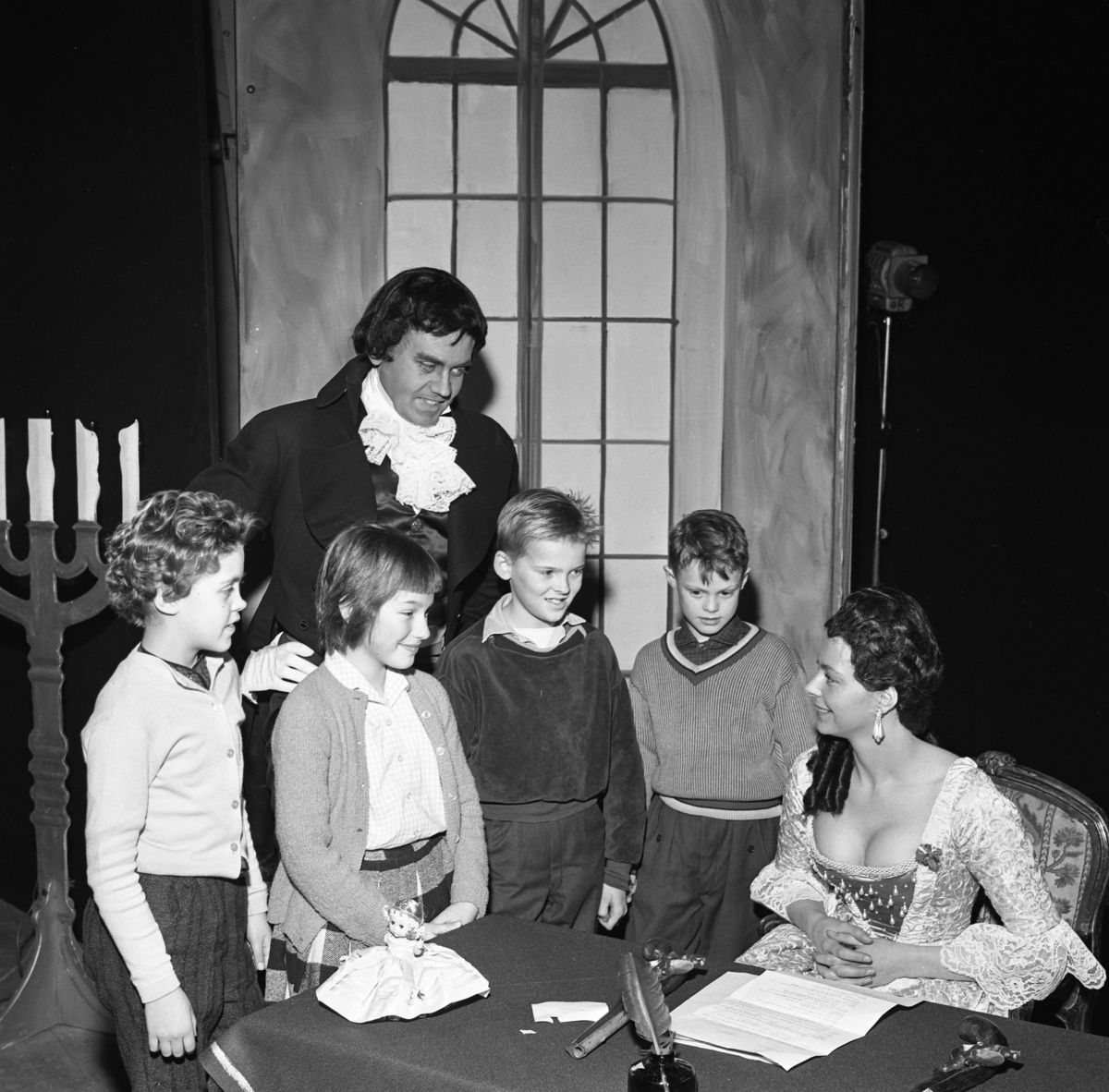 Två skådespelare har bjudit upp fyra barn på scenen. Längst till vänster står Birgitta.