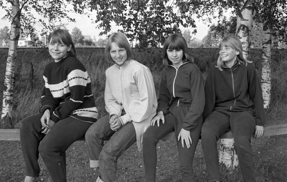 Skolmästerskap på Sturevallen, fyra flickor sitter på staketet. De är, från vänster: Karin Zackrisson, Britt Rosén, Britt-Marie Jehander och Susanne Gunnarsson