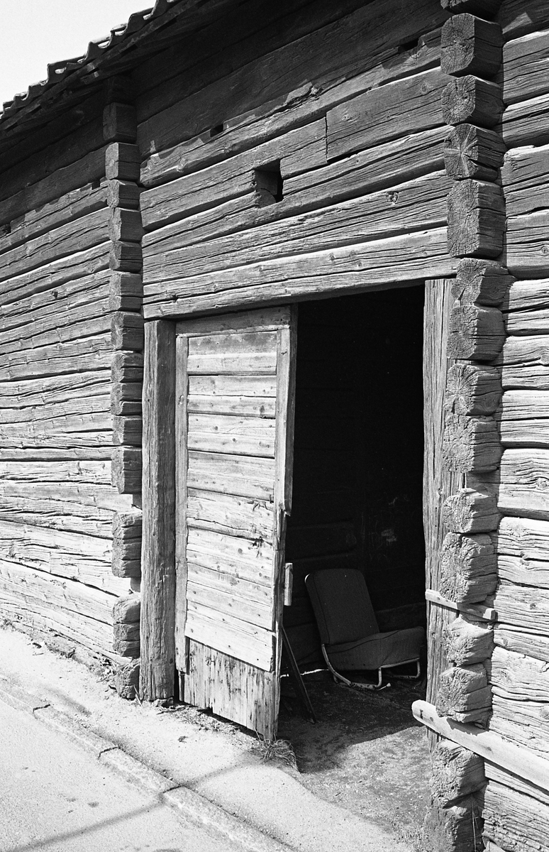 Uthus med liggande timmer. Porten står öppen. En bilsits skymtar där inne.