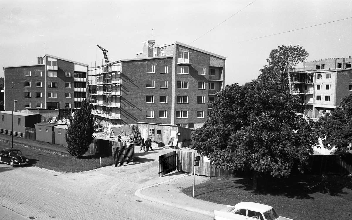 Arbetskupor är uppställda. En lyftkran syns över hustaken.