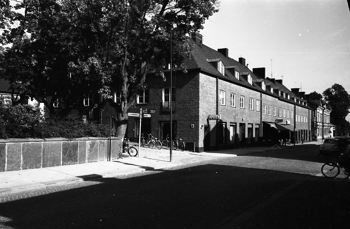 Östra Nygatan. Bakom muren ligger prästgården. Mellan grönskan skymtar Sankt Nikolai kyrka. Apoteket ligger på Östra Nygatan 10. Många cyklar är parkerade utanför. Optiker Lund håller till vid markisen. Längst bort hänger skylten med "Radio TV-hallen". Några bilar står parkerade på vägen.