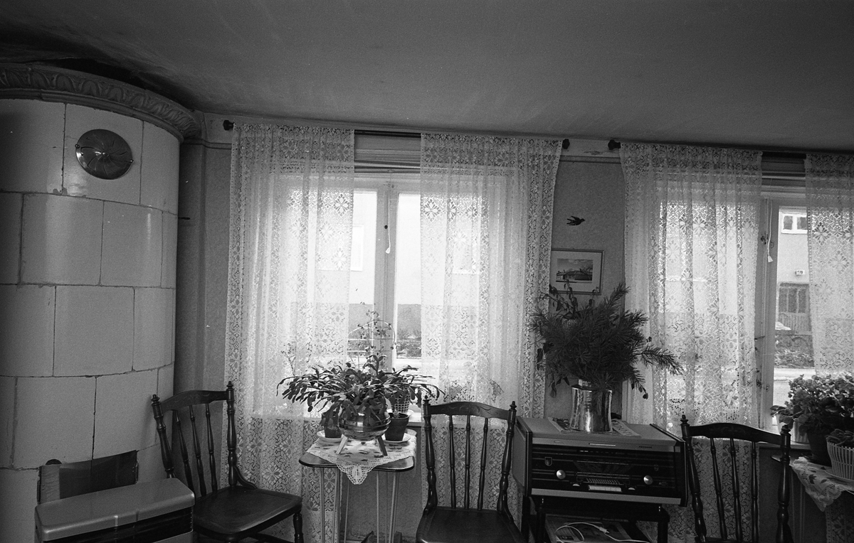 I hörnet står en kakelugn. Framför fönstren står bord med krukväxter. Mellan de båda fönstren ses en radioapparat. Ovanpå den står en kruka (av koppar?) med tallris. Tre pinnstolar.