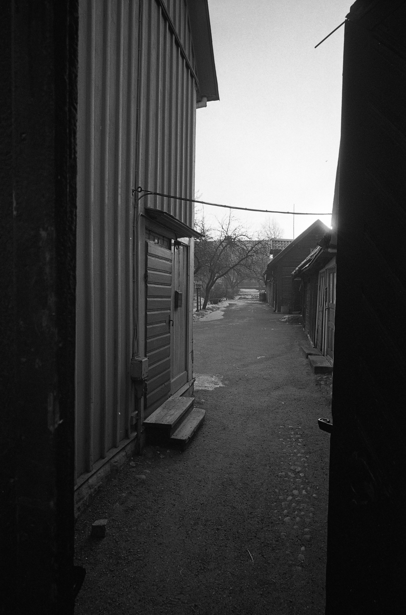 Miljöbild från äldre bebyggelse i kvarteret Tullnären, mellan Storgatan - Trädgårdsgatan och Herrgårdsgatan - Paradisgränd. Boningshus till vänster och uthus till höger.
