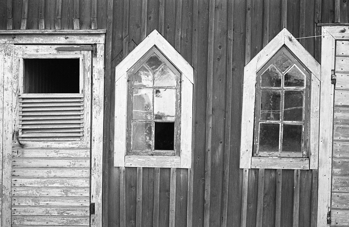 Exteriör. Del av vägg på äldre bebyggelse. Möjligen en trasig dörr till utedasset, två spröjsade fönster (en ruta saknas) samt en förrådsdörr.