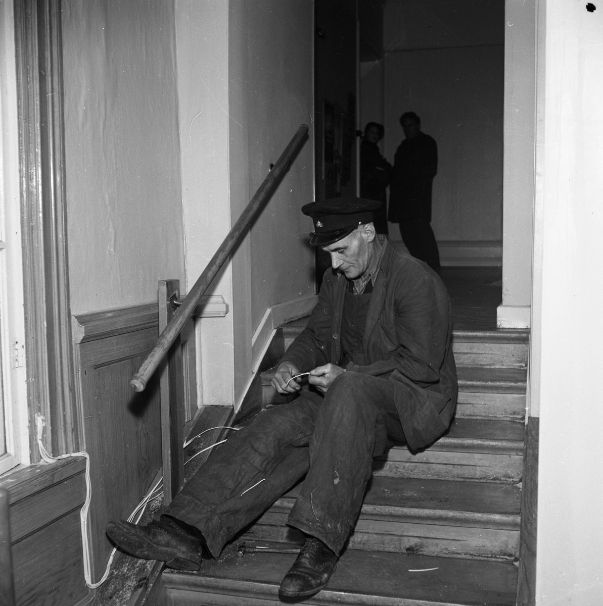 Reparationsarbete efter branden i televerkets lokal på Nygatan. En man sitter i en trappa och lagar ledningar. Han har arbetskläder och en keps med Televerkets märke på.