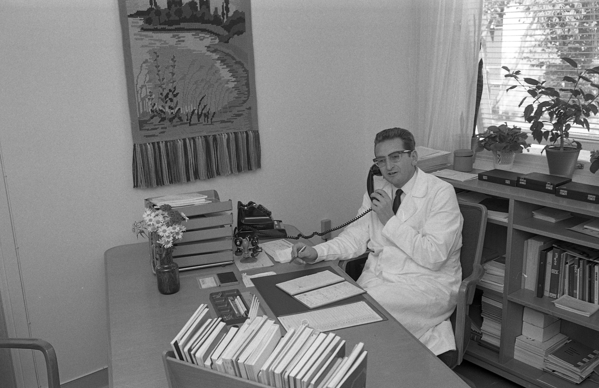 Man i läkarrock. Han talar i telefonen och håller en penna i handen. På skrivbordet finns en arkivställ för papper, ett ställ med böcker och en vas med blommor. Bakom mannens rygg står en låg bokhylla framför fönstret. Ovanpå hyllan ligger några instrumentlådor. En vepa hänger på väggen.