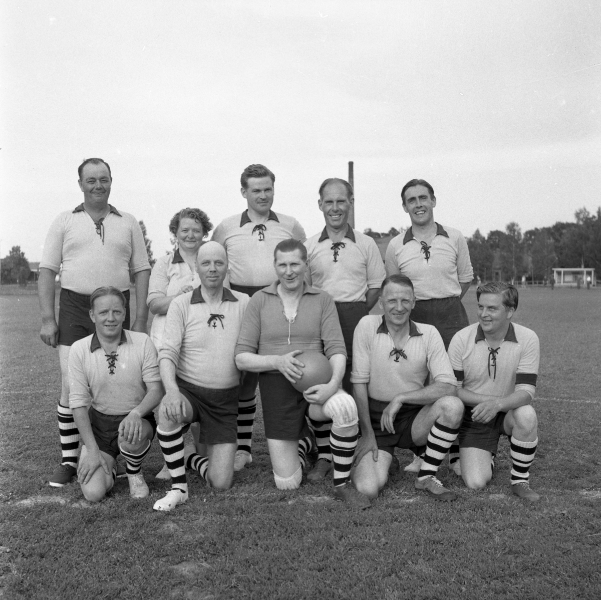 Kyrkofullmäktiges laguppställning. De ska möta stadsfullmäktige (se bild AKF-04200) i en fotbollsmatch.