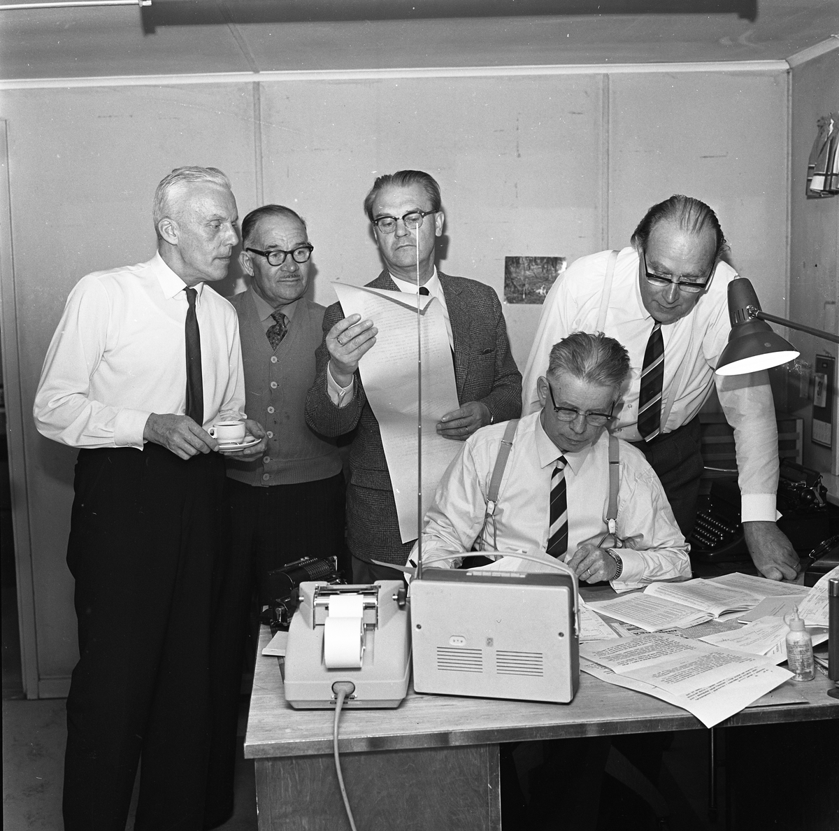 Folkpartiets valvaka på Arboga Tidnings redaktion. Eskil Östlund läser det senaste valresultatet på teleprinterremsan för chefredaktör John Wallstöm (sittande).