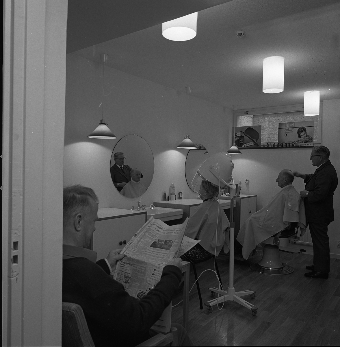 Axel klipper en kund. En kvinna sitter i torkhuven. En man läser en tidning.
