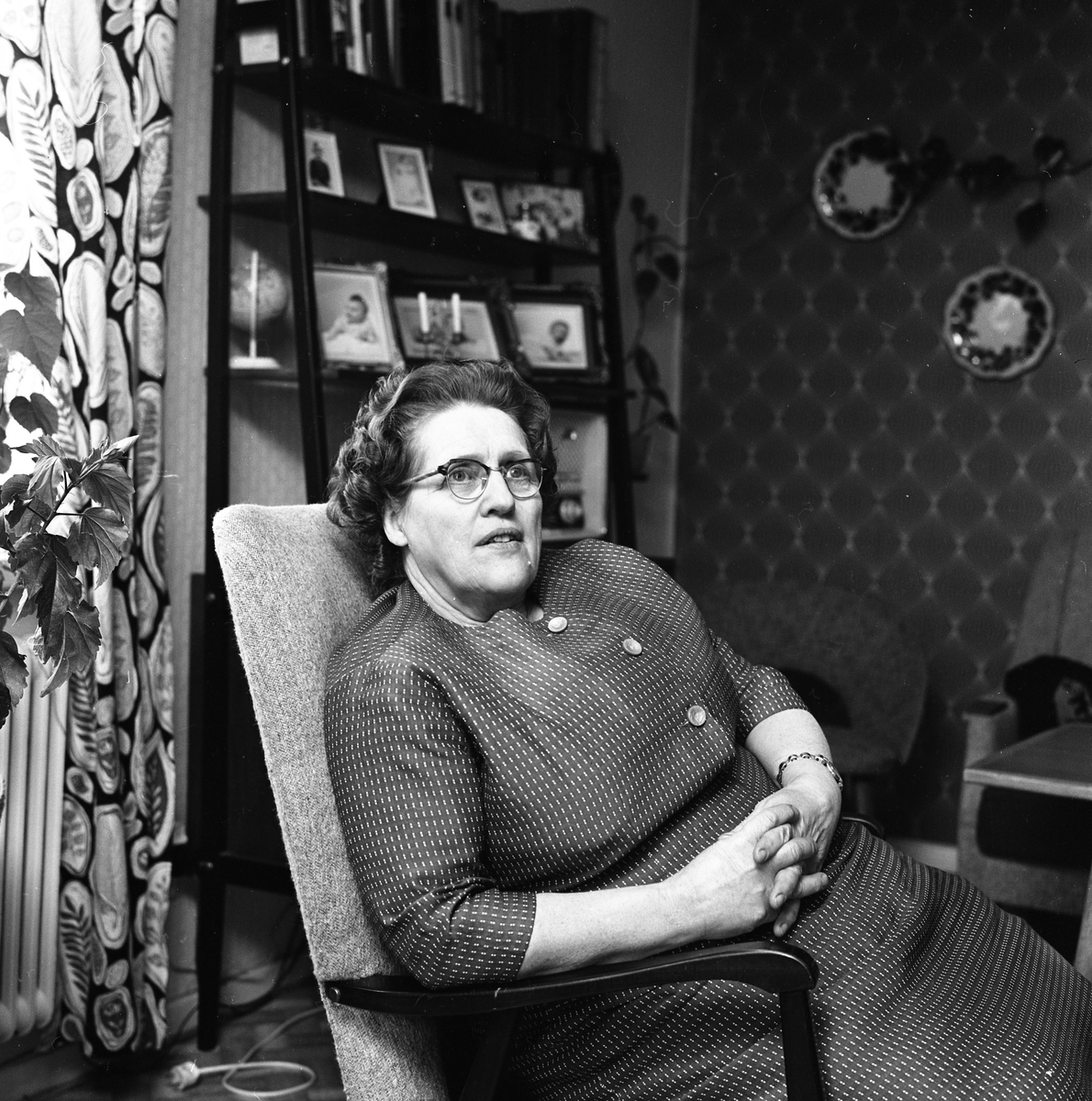 Fru Berglind. Stina Berglind är hustru till John Berglind, i hans andra äktenskap. Hon sitter i en karmfåtölj. Bakom henne ses en bokhylla med fotografier. På väggen hänger två porslinstallrikar.