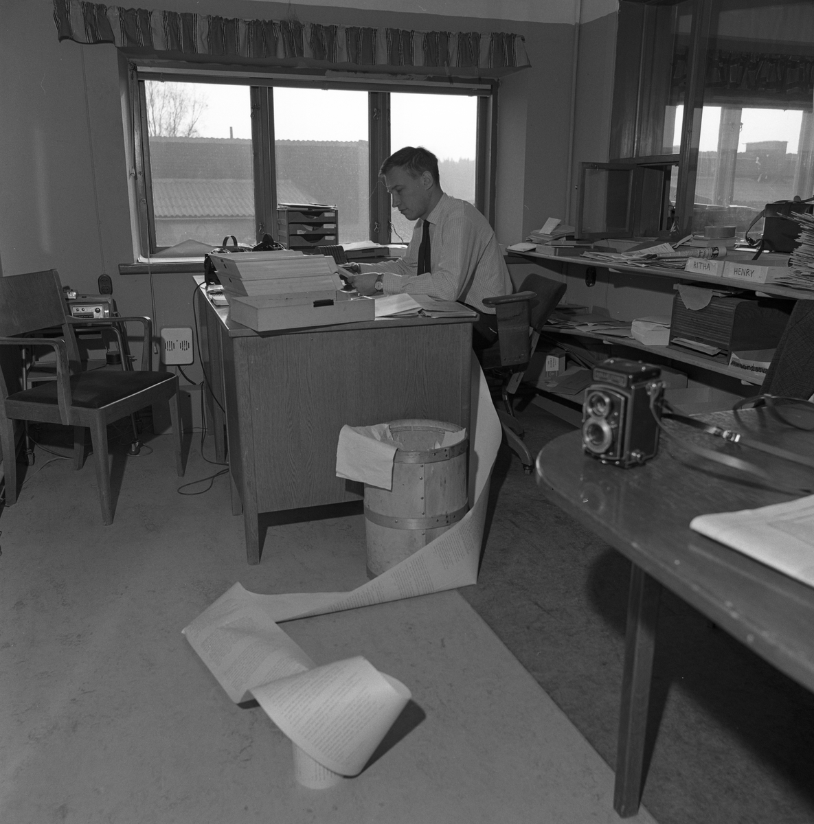 En man arbetar vid sitt skrivbord. Han har en flera meter lång utskrift, delvis liggande på golvet. I förgrunden står en kamera. Mannen sitter på en kontorsstol på hjul. På andra sidan skrivbordet står en karmstol till besökare. Bakom stolen står en skrivmaskin på ett lågt bord. Skrivbordet står intill fönstret, det syns att kontoret ligger på andra våningen. Bakom mannens rygg finns en låg hylla som är full av papper och tidningar.
