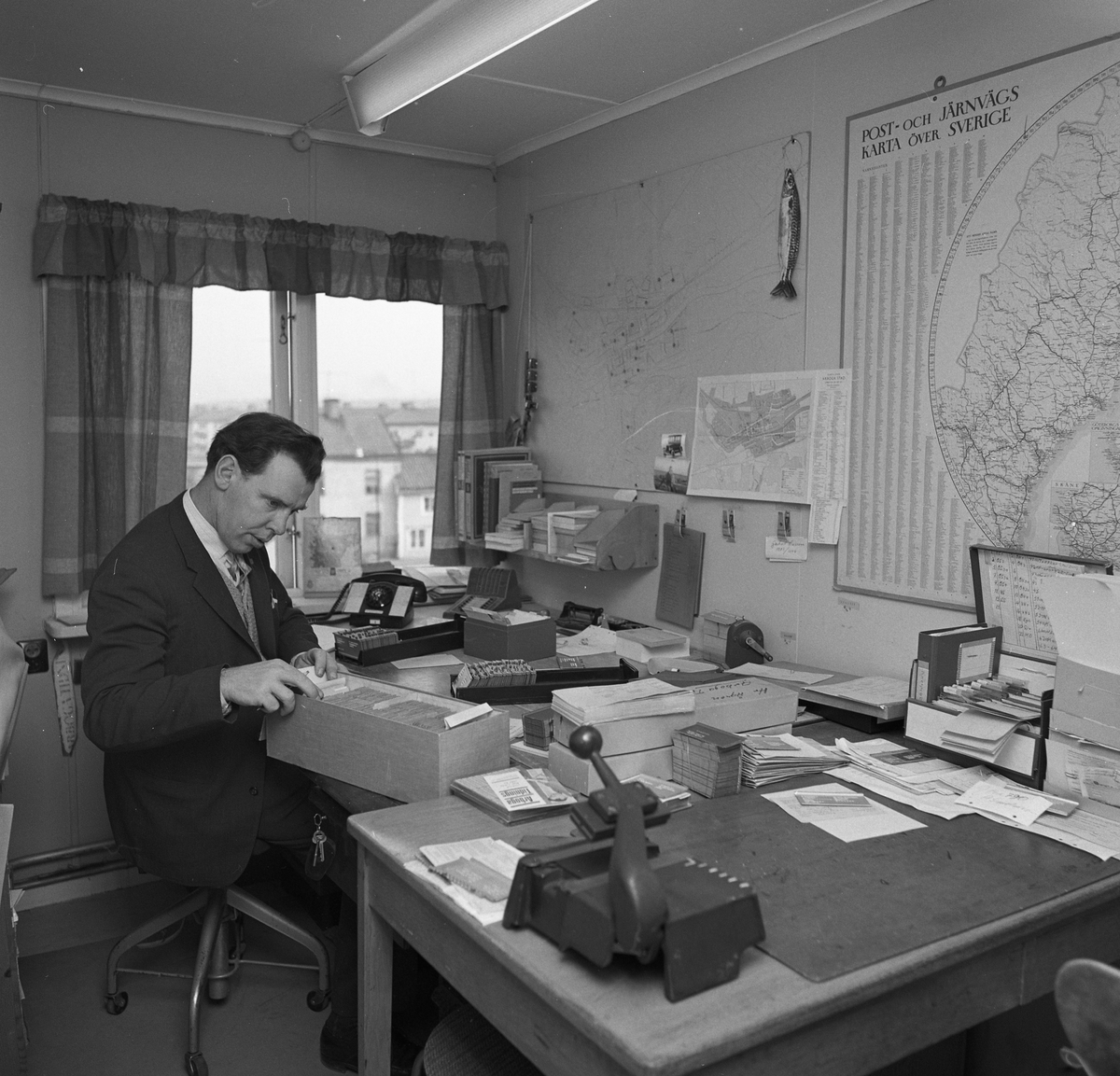 Arboga Tidning, personal och interiör. En man sitter vid skrivbordet och bläddrar i ett kartotek. På skrivbordet finns bland annat en telefon och en pennvässare. På väggen sitter stora kartor. Utsikten genom fönstret visar att kontoret ligger på andra våningen i huset.