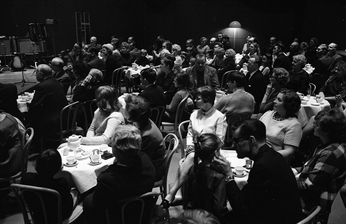 Arbogabor gästar radioprogrammet Frukostklubben, ett underhållningsprogram som sänds på lördagsmorgnar. Publiken sitter vid runda bord och dricker kaffe.