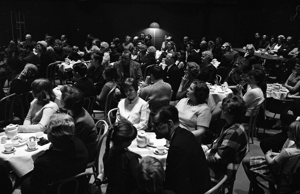 Arbogabor deltar i radioprogrammet Frukostklubben, ett underhållningsprogram som sänds på lördagsmorgnar. Publiken sitter vid små, runda bord och dricker kaffe.