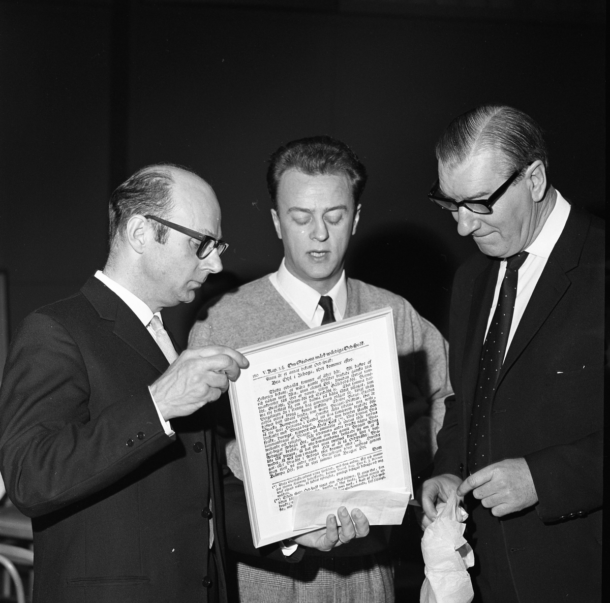 Mannen till vänster liknar Anders Gernandt, centerpartist i Arboga stadsfullmäktige. Han håller i en tavla, med text på baksidan. Mannen i mitten ser på tavlan.