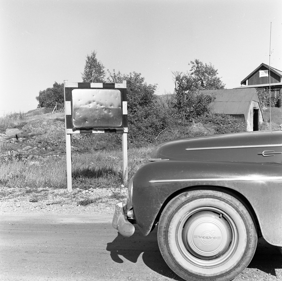 Motorhuven på en bil. Bilen färdas på en grusväg. En övervakningsspegel / "skvallerspegel" är uppsatt i vägrenen. Bortanför bilen ses två byggnader i en backe. Det ena huset är ett boningshus.
