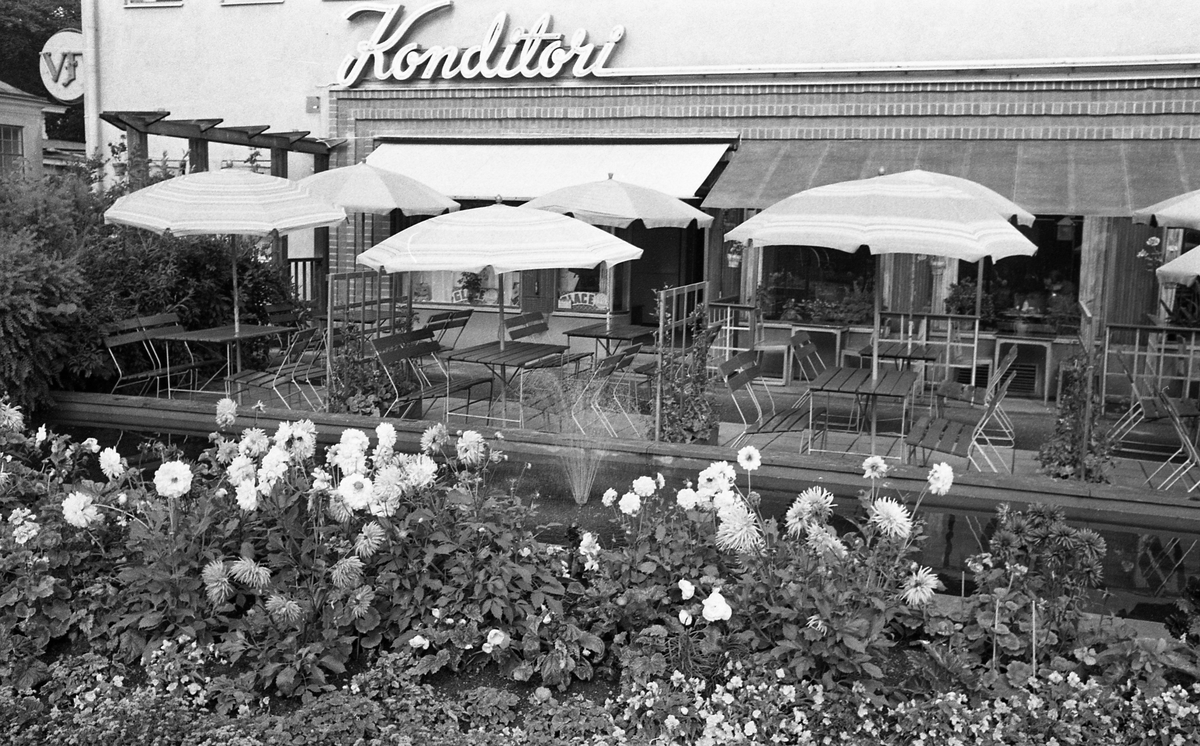 Konditori Paletten i Medborgarhuset / Folkan intill Kapellgatan. Uteservering med bord, bänkar och parasoll. Nedanför altanen växer blommor. Ingen människa syns i bilden.