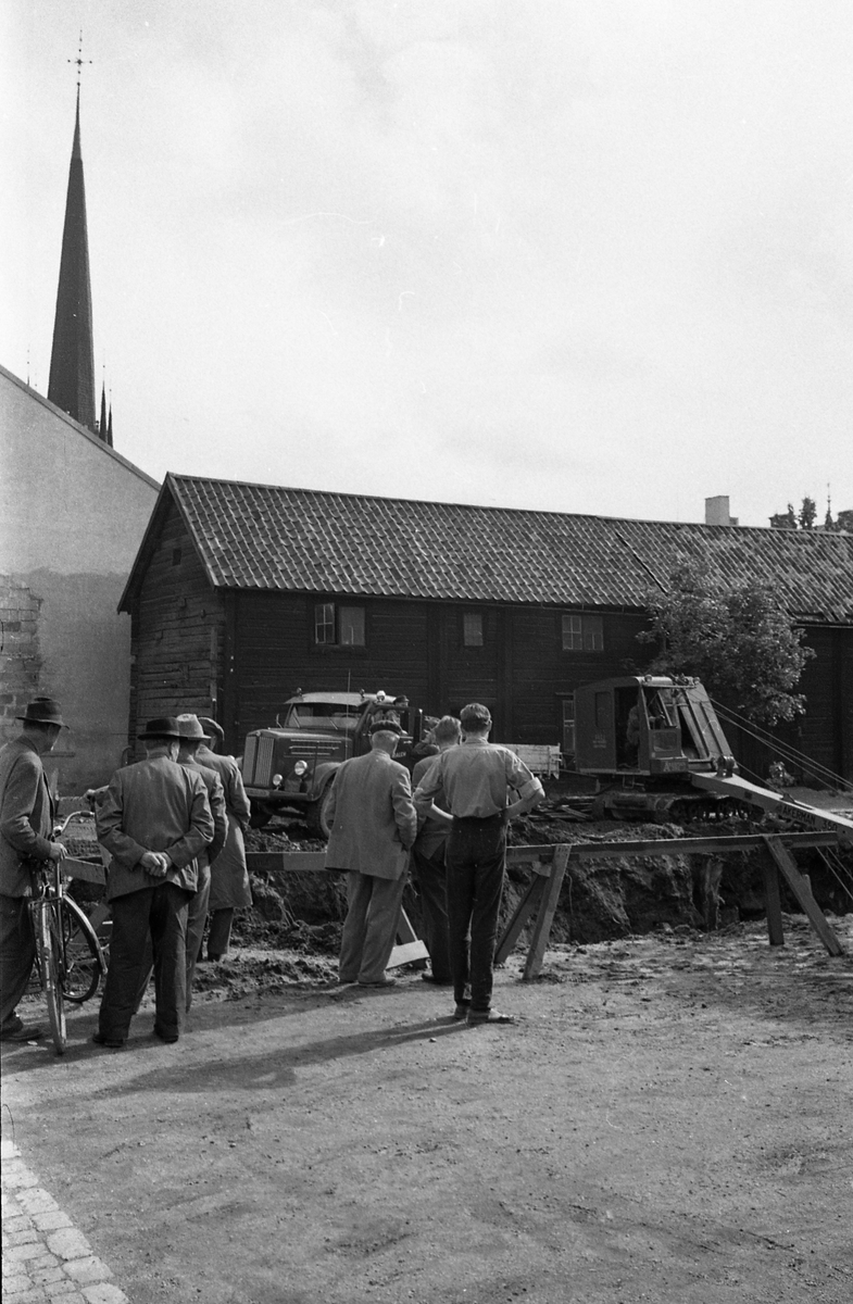 Några män är samlade vid en stor grop. En grävmaskin och en lastbil är i arbete. Två bockar är uppställda som fallskydd. Männen står med ryggarna mot fotografen. En av dem har en cykel. I bakgrunden ses tornet på Heliga Trefaldighetskyrkan.