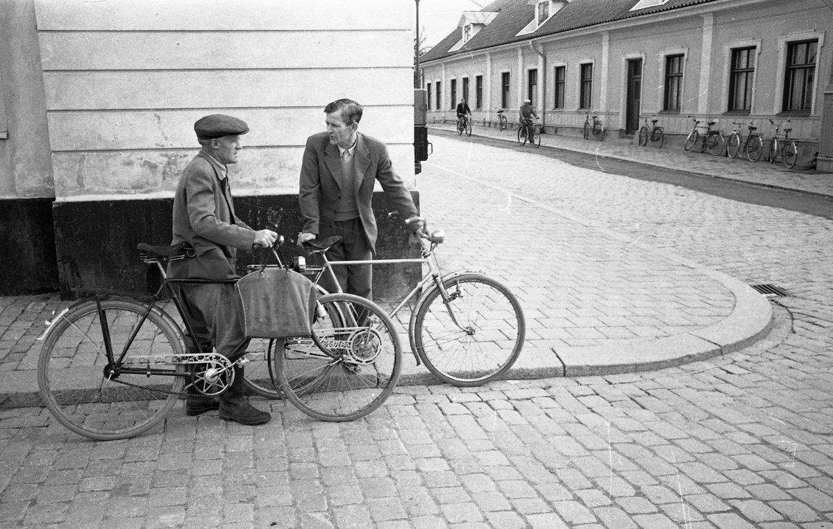 Två män samtalar i hörnet av den gatstensbelagda Kapellgatan och Rådhusgatan. Männen har var sin herrcykel. Mannen till vänster bär keps och en matsäcksväska hängande på styret. Den högra mannen är Johan "Borrar-Janne" Karlsson, som arbetar på Arboga Mekaniska Verkstad, Meken. Utmed Kungsgårdens fasad står flera cyklar parkerade och på Rådhusgatan kommer två personer cyklande.