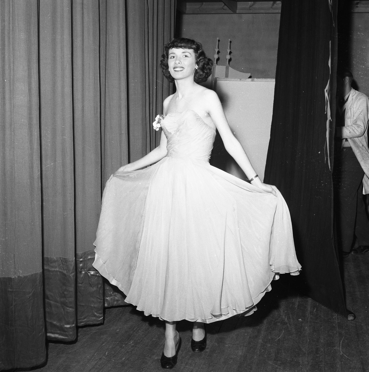 Deltagarna i Arbogarevyn spelar upp sin Jubileumsrevy. Här ses en av artisterna i vacker klänning.