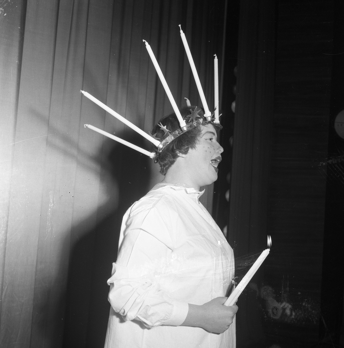 Arbogarevyn spelar upp sin Jubileumsrevy. Man utklädd till Lucia med långa stearinljus i kronan och ett ljus i handen.