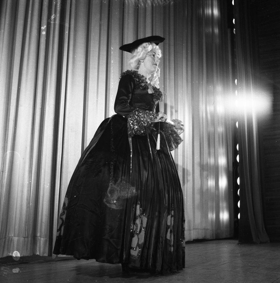 Arbogarevyns medlemmar spelar upp sin Jubileumsrevy. Här står Karin Liljeborg, även kallad Noppan, uppklädd på scenen.
